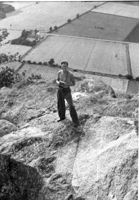 En man med bar överkropp och kamera runt halsen står på berget med Uppgränna nedanför sig.