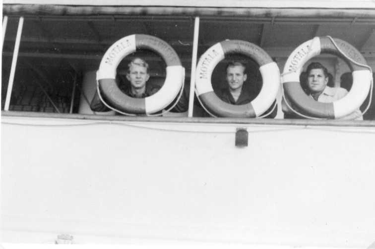 Tre unga män kikar ut genom livbojar ombord på Motala Express. Bojarna är märkta "Motala Express".