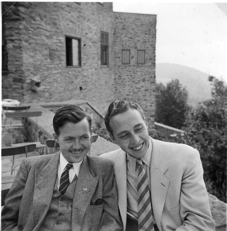 Två kostymklädda män med slips på Gyllene Utterns veranda.