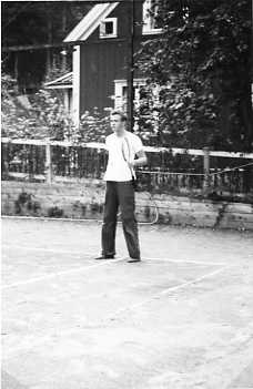 En man i t-shirt och långbyxor med tennisrack på tennisplanen i Gränna.