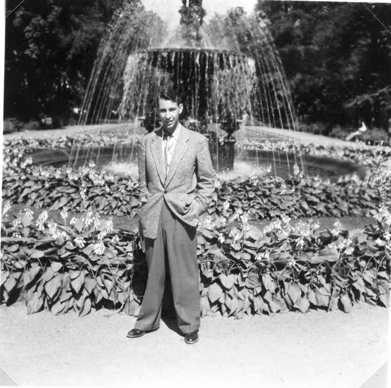 En kostymklädd man står framför fontänen i Rådhusparken, Jönköping.