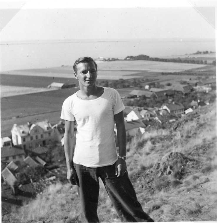 En ung man i t-shirt står på Grännaberget med Gränna nedanför sig.