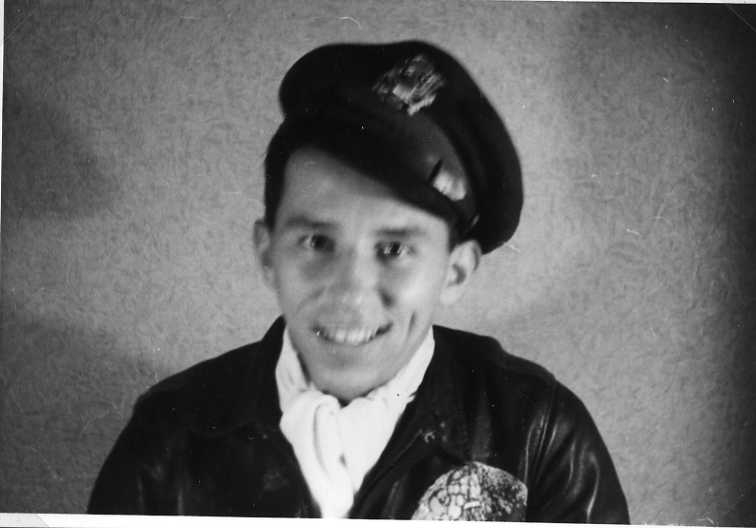 En ung man i uniform: skinnjacka, scarf och skärmmössa på sniskan.
