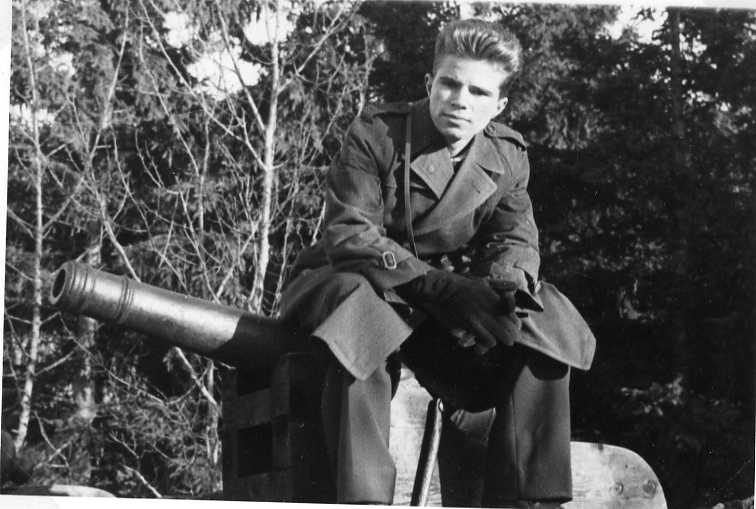 En ung man i rock och handskar sitter på en av salutkanonerna på Grännaberget.