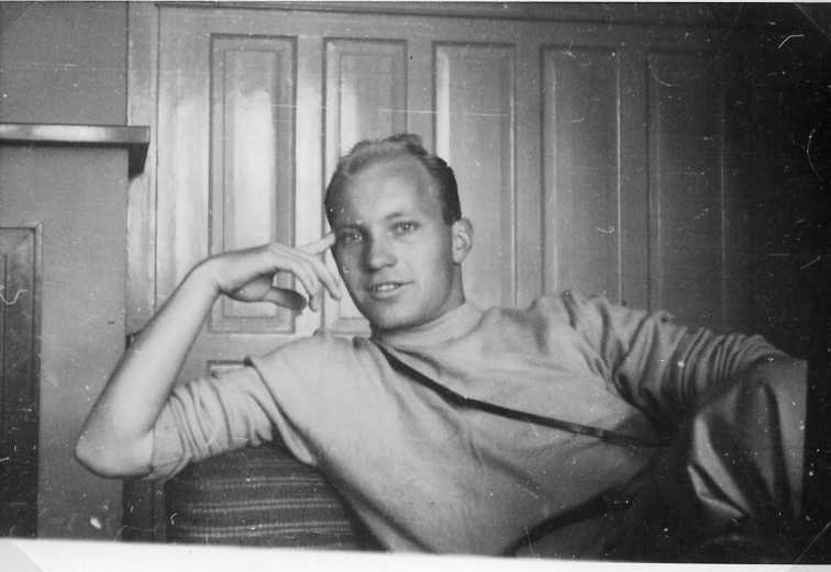 Porträtt av en ung man i ljus tröja, sitter tillbakalutad i en soffa.