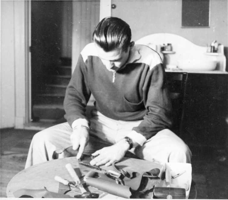 En man sitter lutad över ett bord och skär bitar i läder efter en mall.