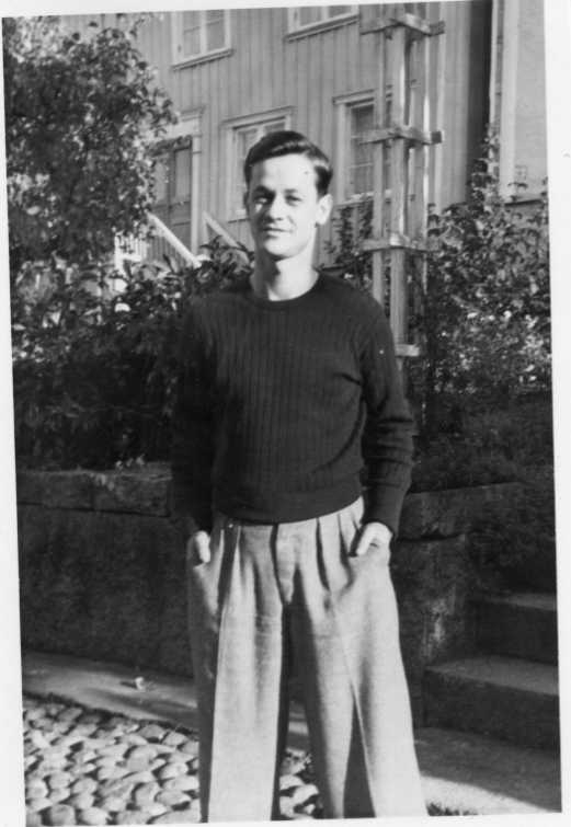 En man i tröja och byxor står på en kullerstensbelagd yta nedanför ett hus.
