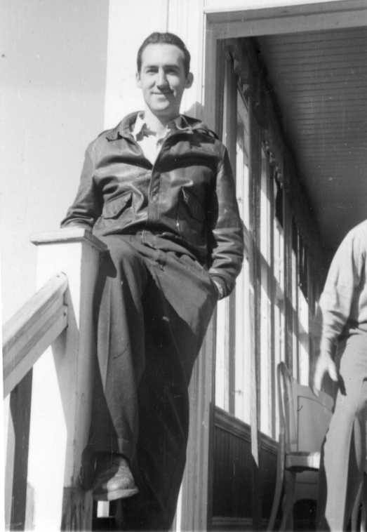 En man i skinnjacka sitter på ett trappräcke i solen, möjligen kapten B R Baier.