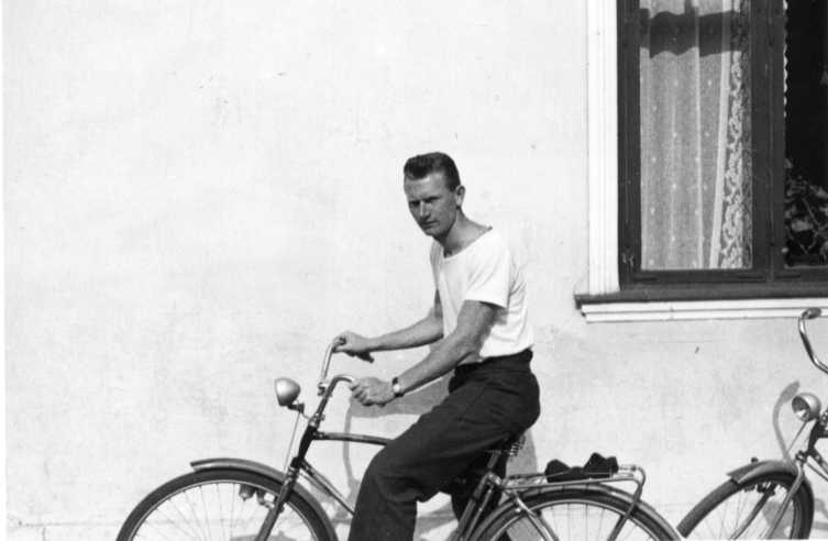 En man i t-shirt sitter på en cykel vid en ljusputsad husvägg.