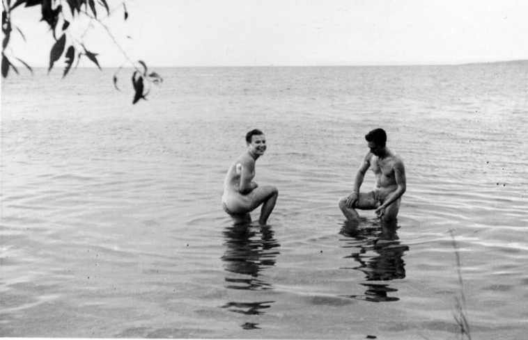 Två nakna män som tvättar sig i en sjö, troligen Vättern.