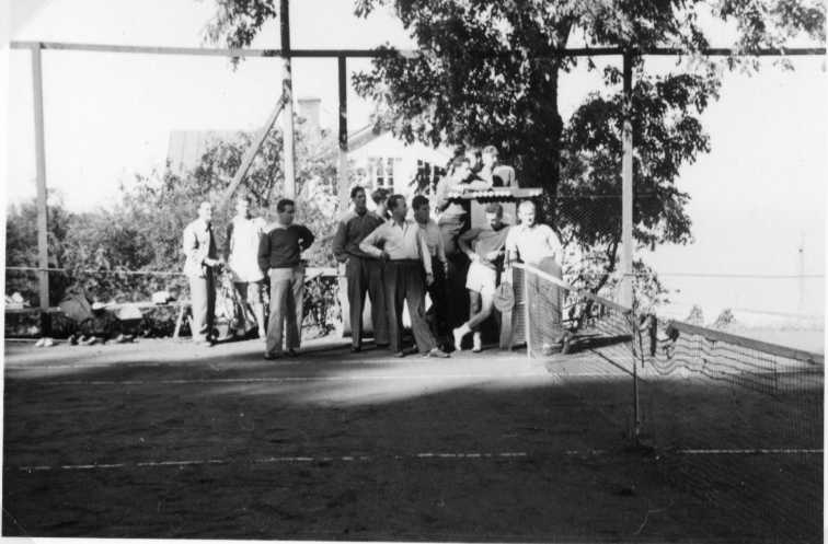 En grupp män samlade runt domaren på tennisbanan vid Jönköpingsvägen i Gränna.