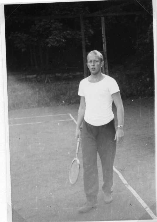 En man i vit t-shirt med tennisrack på tennisbanan i Gränna.