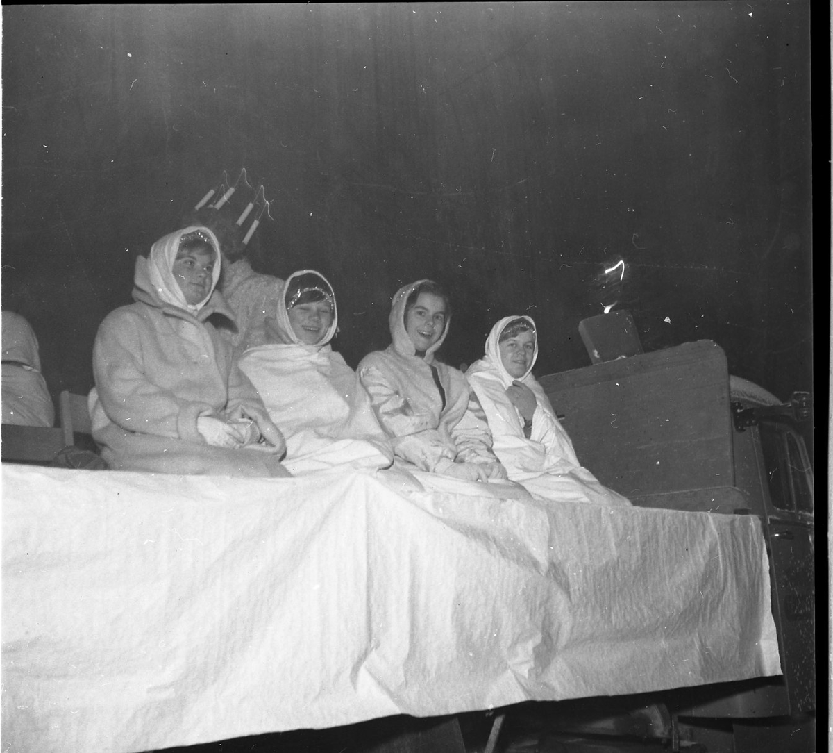 En lucia och några tärnor sitter på ett lastbilsflak. Lucian sitter lite högre äv tärnorna. Fyra tärnor sitter invirade i filtar. Tre ler mot kameran.