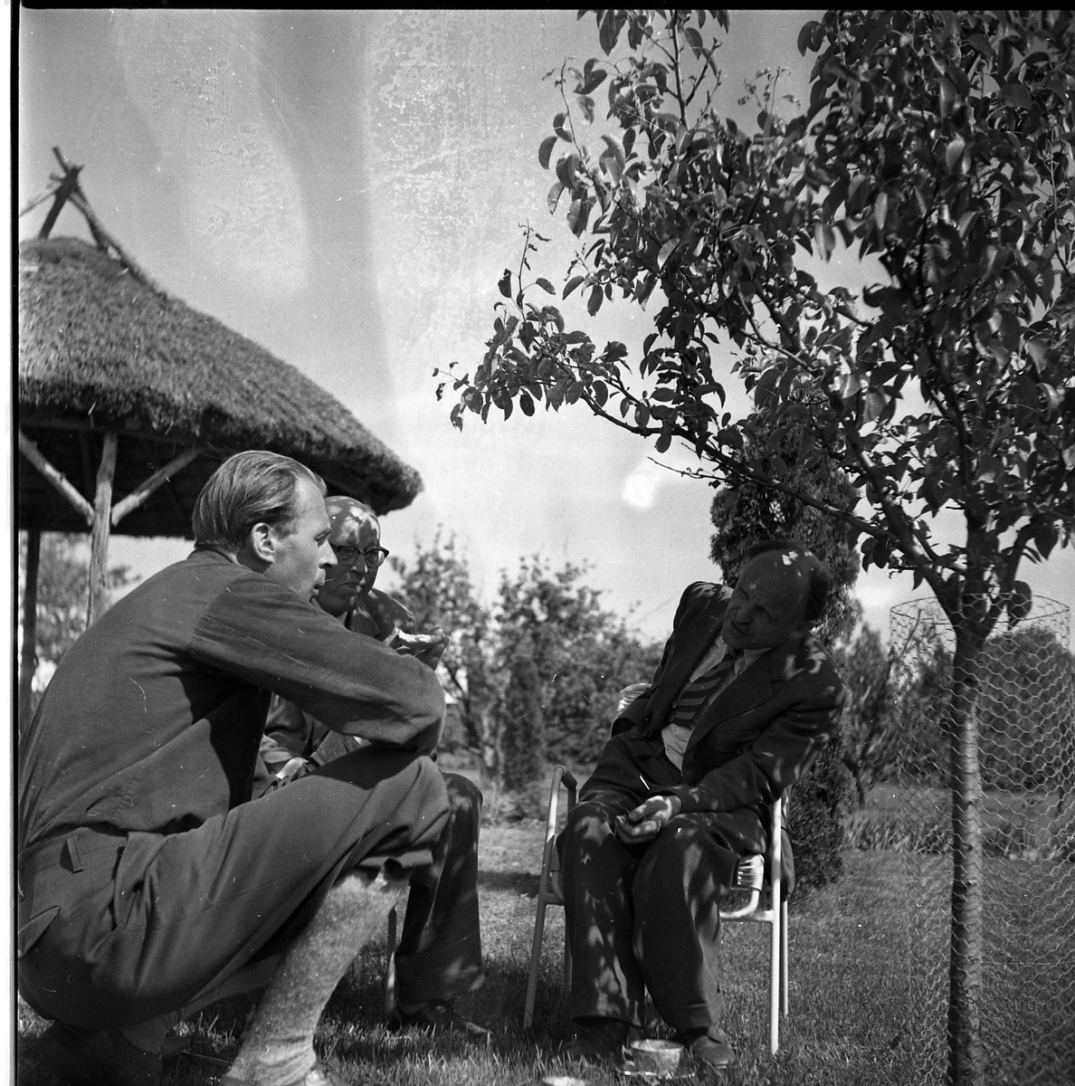 Tre män sitter och pratar och dricker kaffe. De sitter utomhus under ett ungt träd. Till vänster står ett parasol tillverkat i vass.