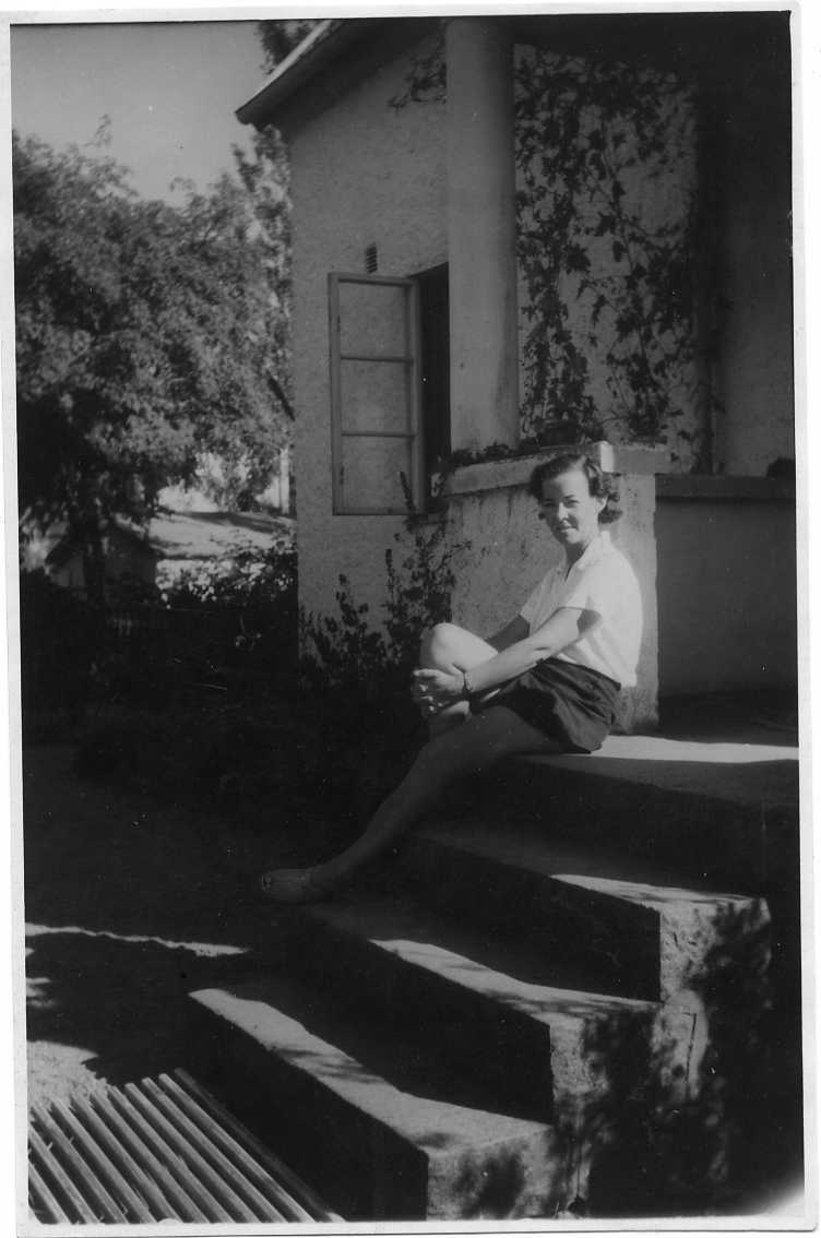 En kvinna sitter på en farstutrappa till ett putsat hus med kolonner vid entrén. Hon har kortbyxor och en kortärmad ljus blus.