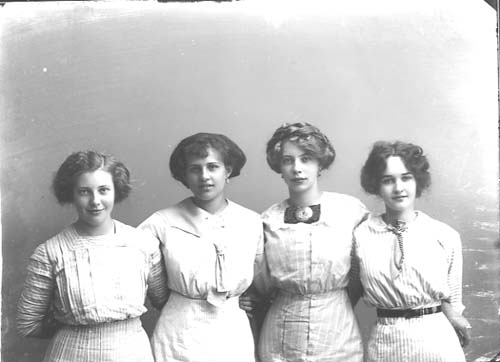 Gruppbild med fyra unga kvinnor i ljusa klänningar och stora hattar. Nummer tre från vänster är troligen Gertrud Brenner.