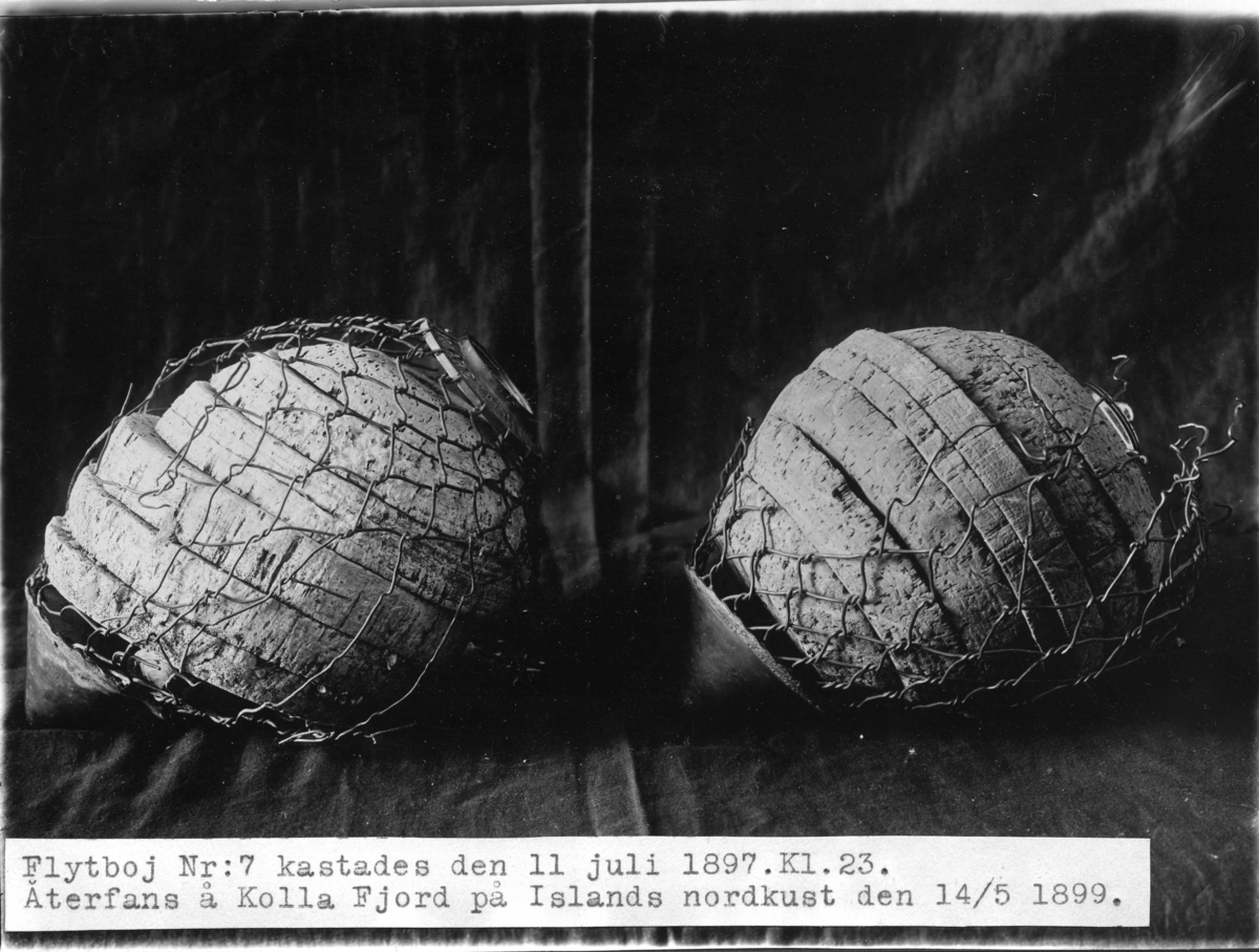 "Flytboj Nr: 7 kastades den 11 juli 1897. kl 23. Återfans å Kolla Fjord på Islands nordkust den 14/5 1899."