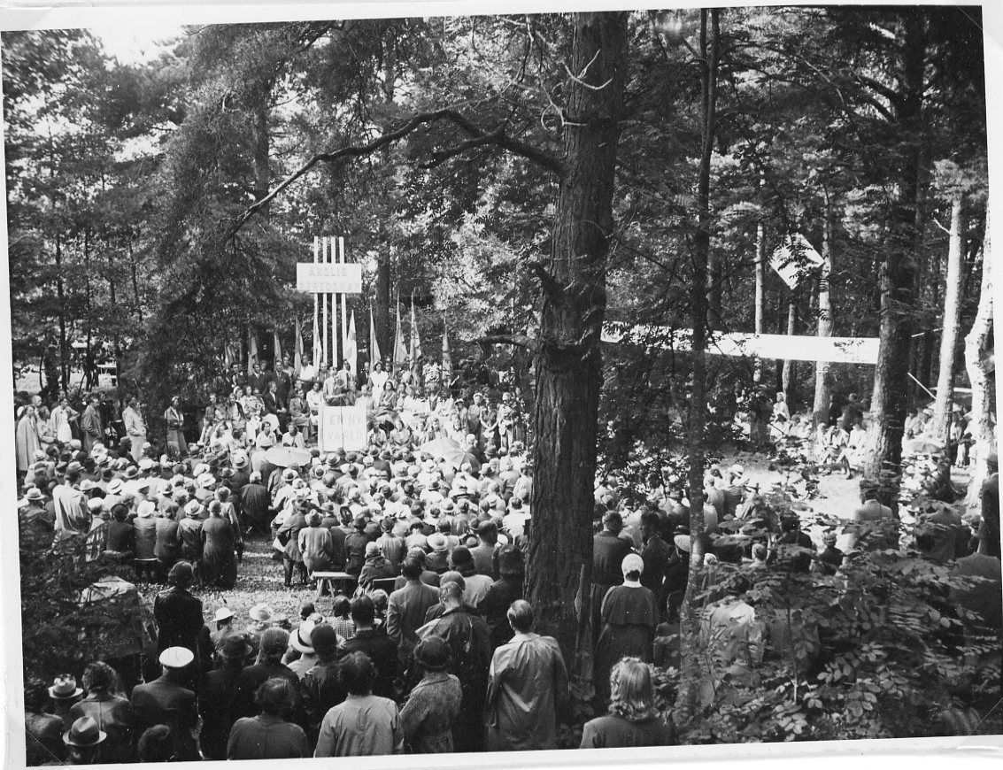 En stor folksamling stående och sittande utomhus framför ett podium med texten: "En ny värld". Bakom höga stolpar med ett anslag "Andlig beredskap".