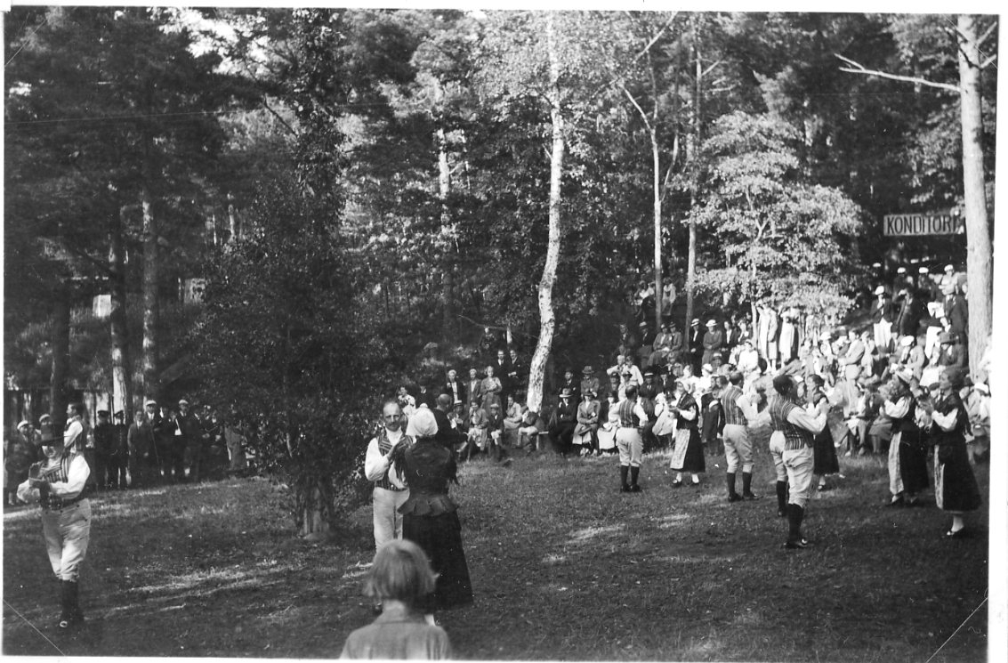 Folkdans på Grännaberget. Publik sitter i slänten i bakgrunden.
