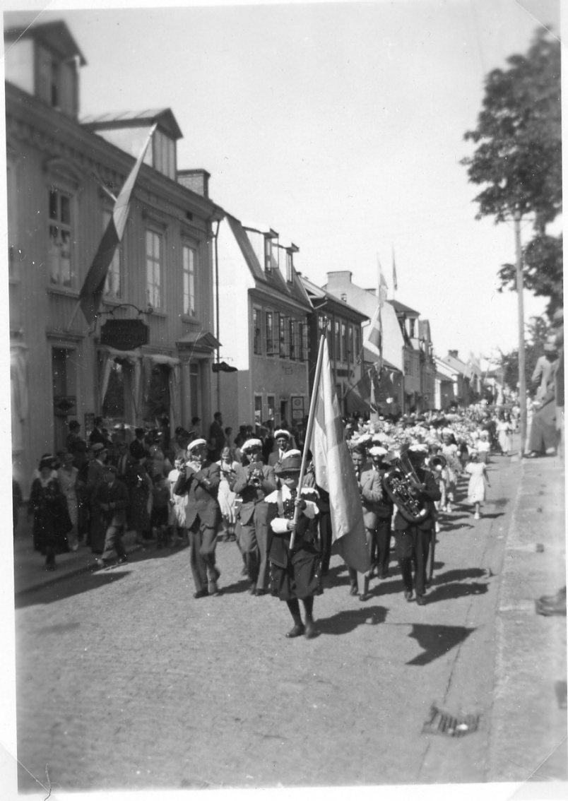 En musikkår följd av en folksamling marscherar bakom en fanbärare i 1600-talsdräkt söderut på Brahegatan i Gränna.