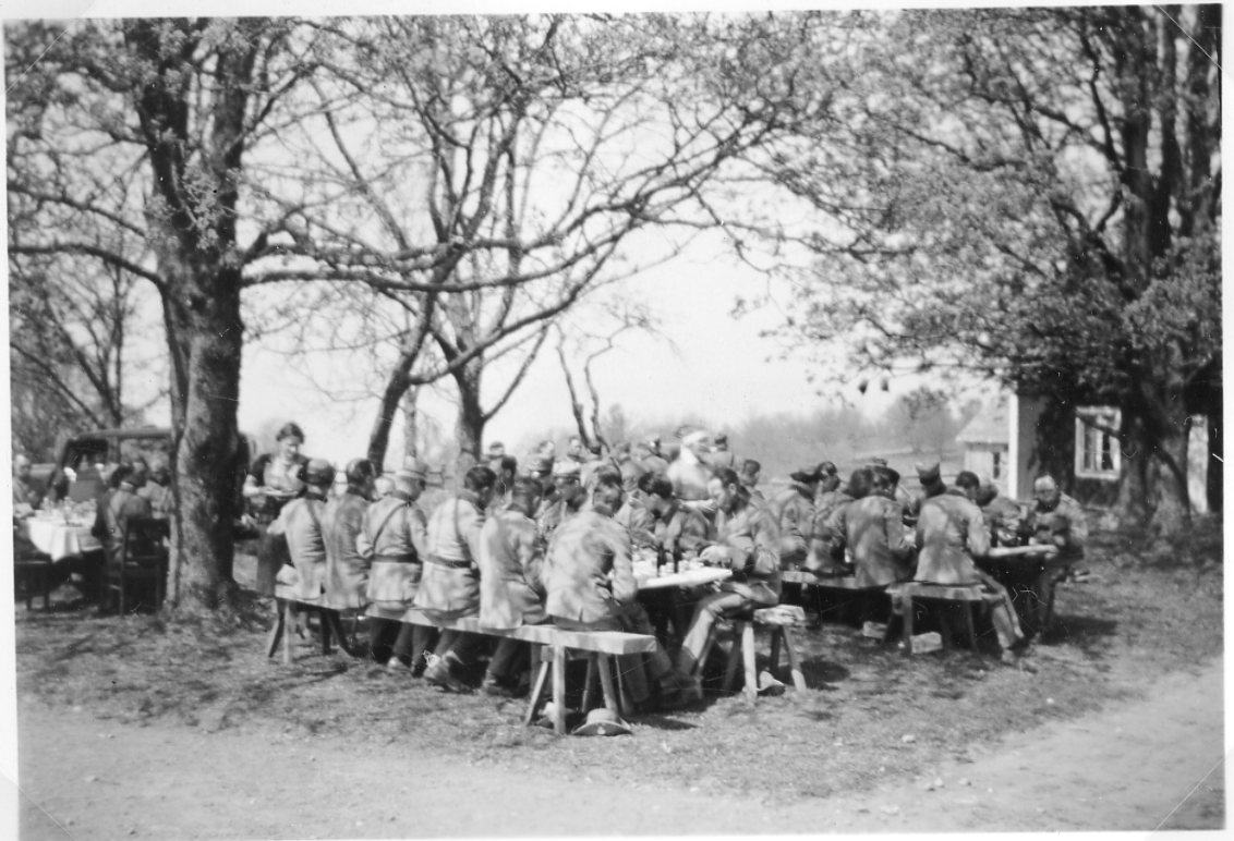 Militärer sitter utomhus på bänkar vid enkla bord i skugga av träd och äter. En kvinna till vänster tycks passa upp på dem.