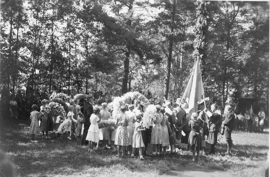 Barn med blomsterbågar och fanbärare, festplatsen på Grännaberget.