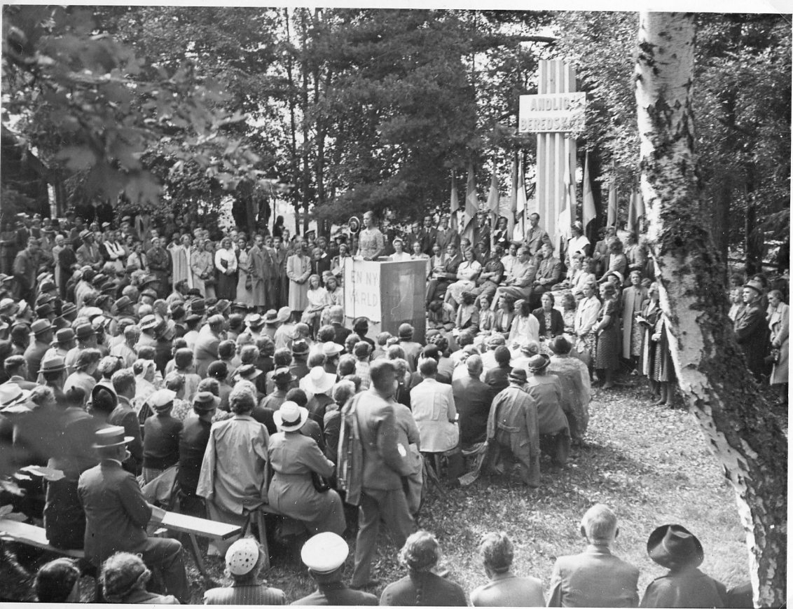 En stor folksamling stående och sittande utomhus framför ett podium med texten: "En ny värld". Bakom höga stolpar med ett anslag "Andlig beredskap".