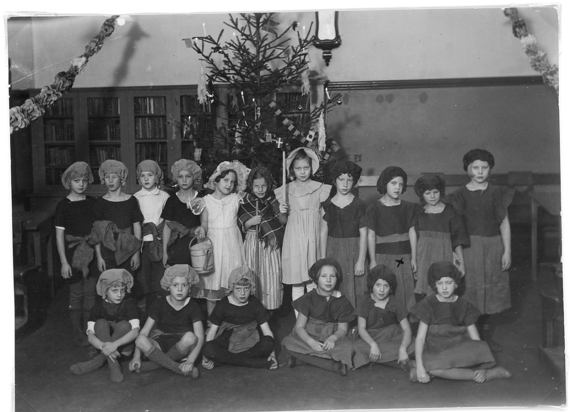 Gruppbild med barn; flickor och pojkar sannolikt utklädda för någon julspel. Det står i ett klassrum framför en klädd julgran.