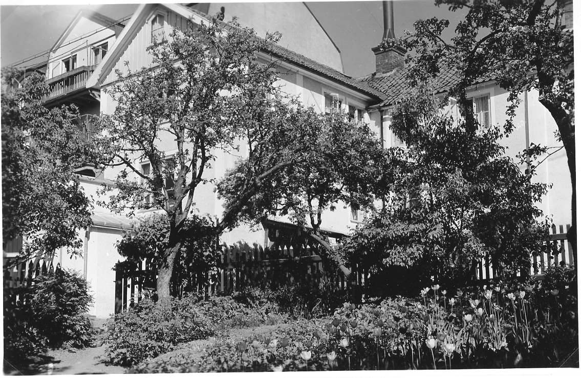 En bakgård med spjälstaket och fruktträd.