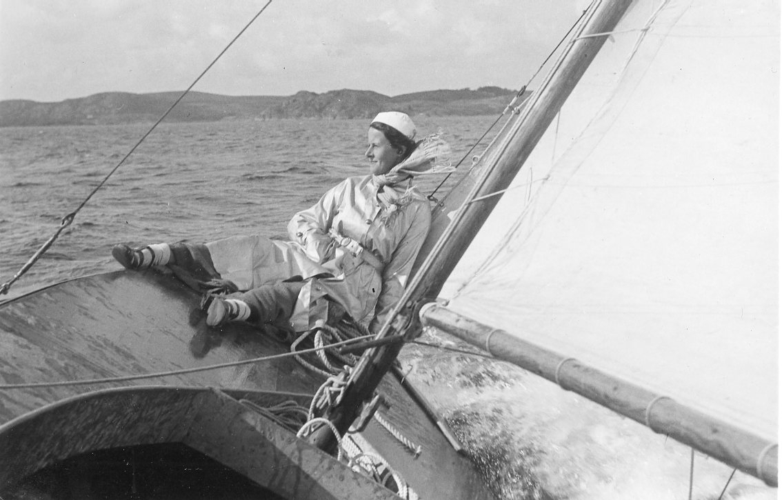 En kvinna sitter i fören på en segelbåt som lutar kraftigt åt styrbords sida.