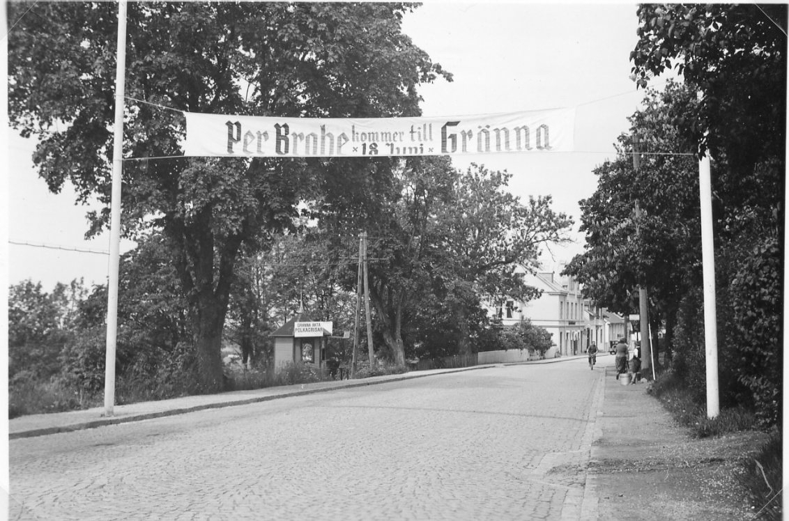 Infarten till Gränna vid söder tull. Över vägen hänger texten: "Per Brahe kommer till Gränna 18 juni". Till vänster en liten kiosk som säljer "Gränna äkta polkagrisar".
