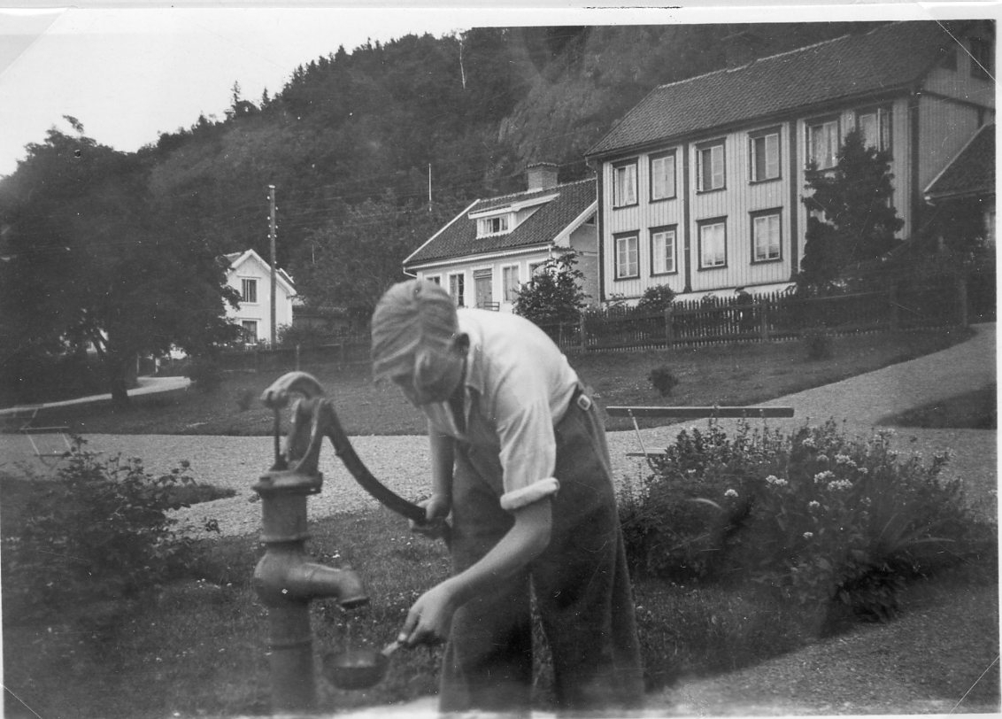 En pojke pumpar upp vatten från en brunn i Braheparken i Gränna.