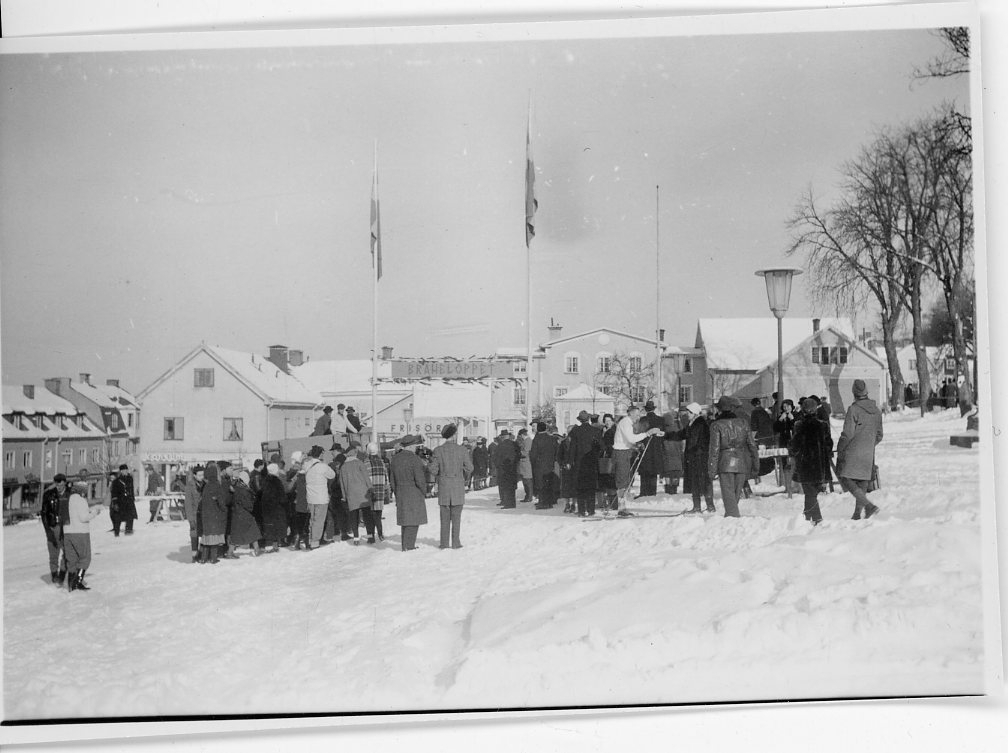 En folksamling runt skidåkare på Gränna torg.