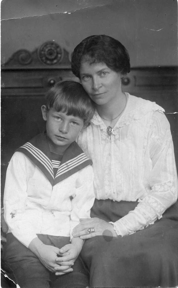 En pojke i sjömanskostym och hans mamma sitter tätt intill varandra. Vykort.