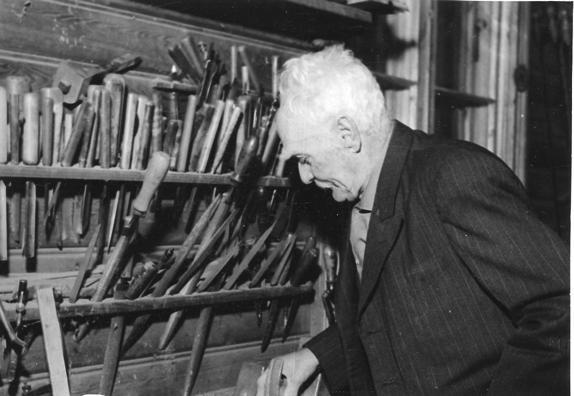 En äldre man vid en vägg med åtskilliga snickarverktyg.