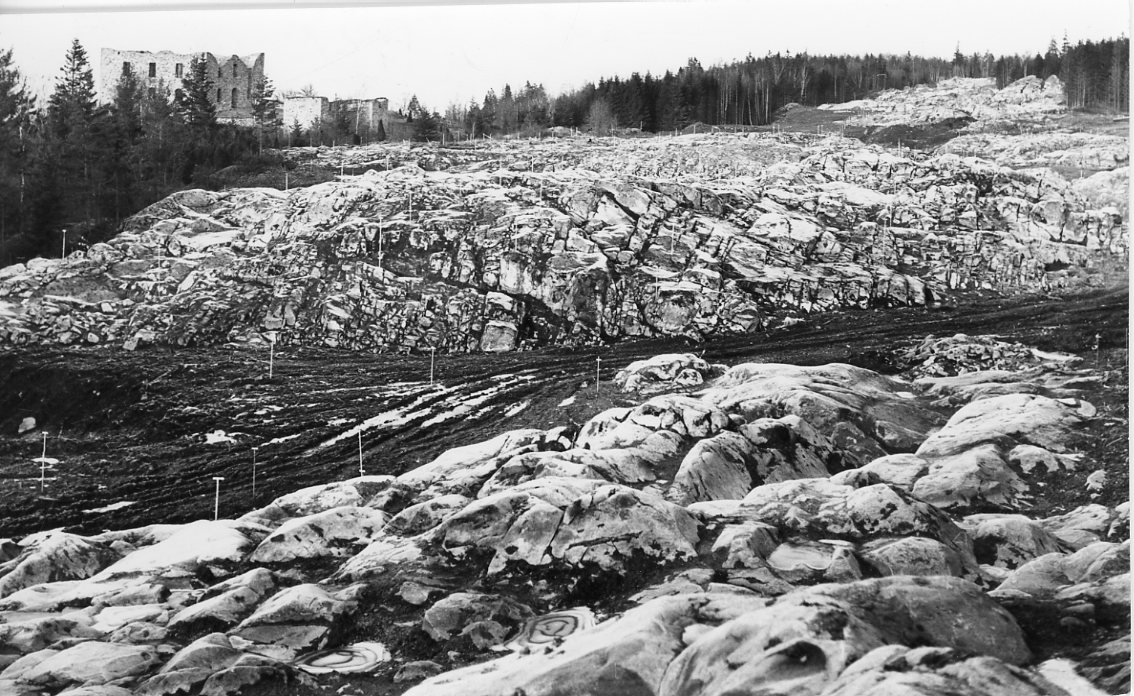 En bergig terräng framför Brahehus slottsruin. Markarbete för byggandet av motorvägen. Ett stort antal pinnar sitter i marken.