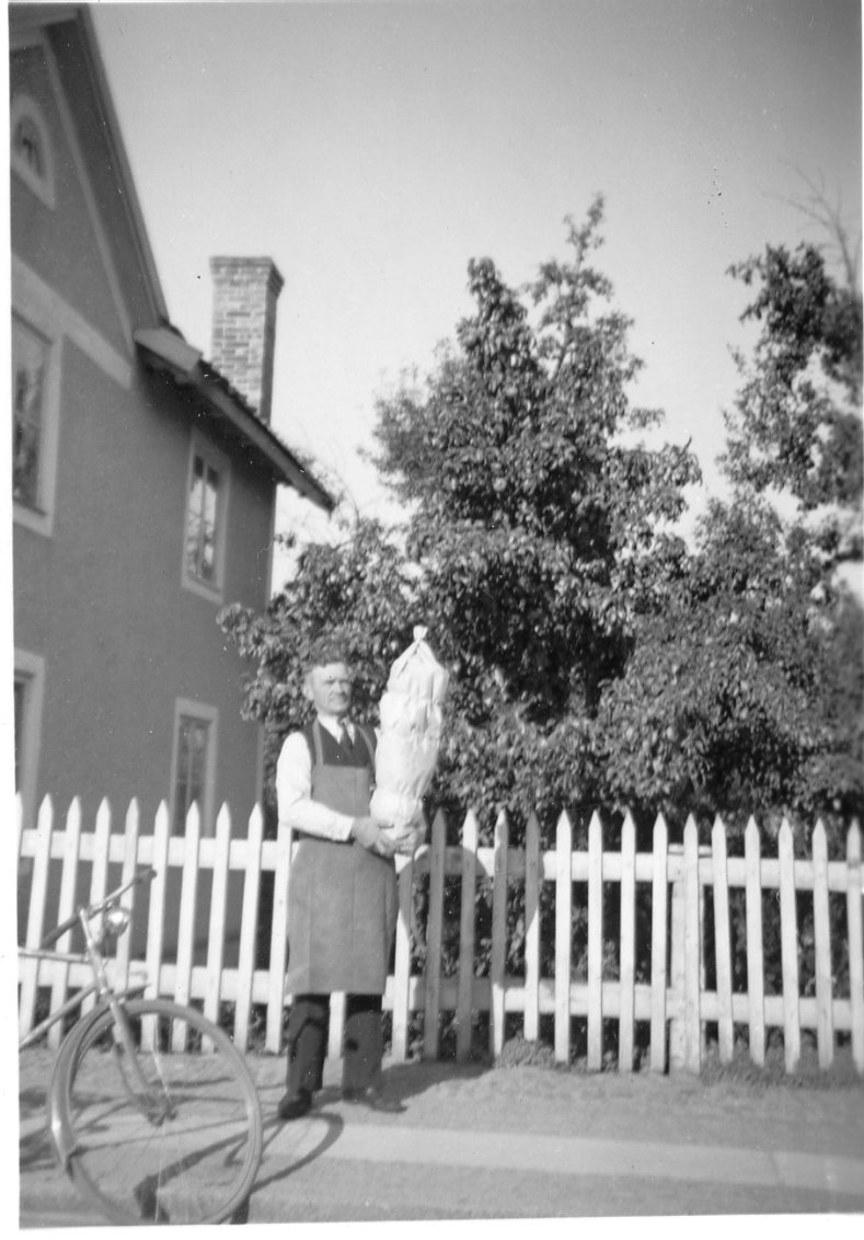 En man med förkläde står på en trottoar med ett smalt, högt paket i famnen.