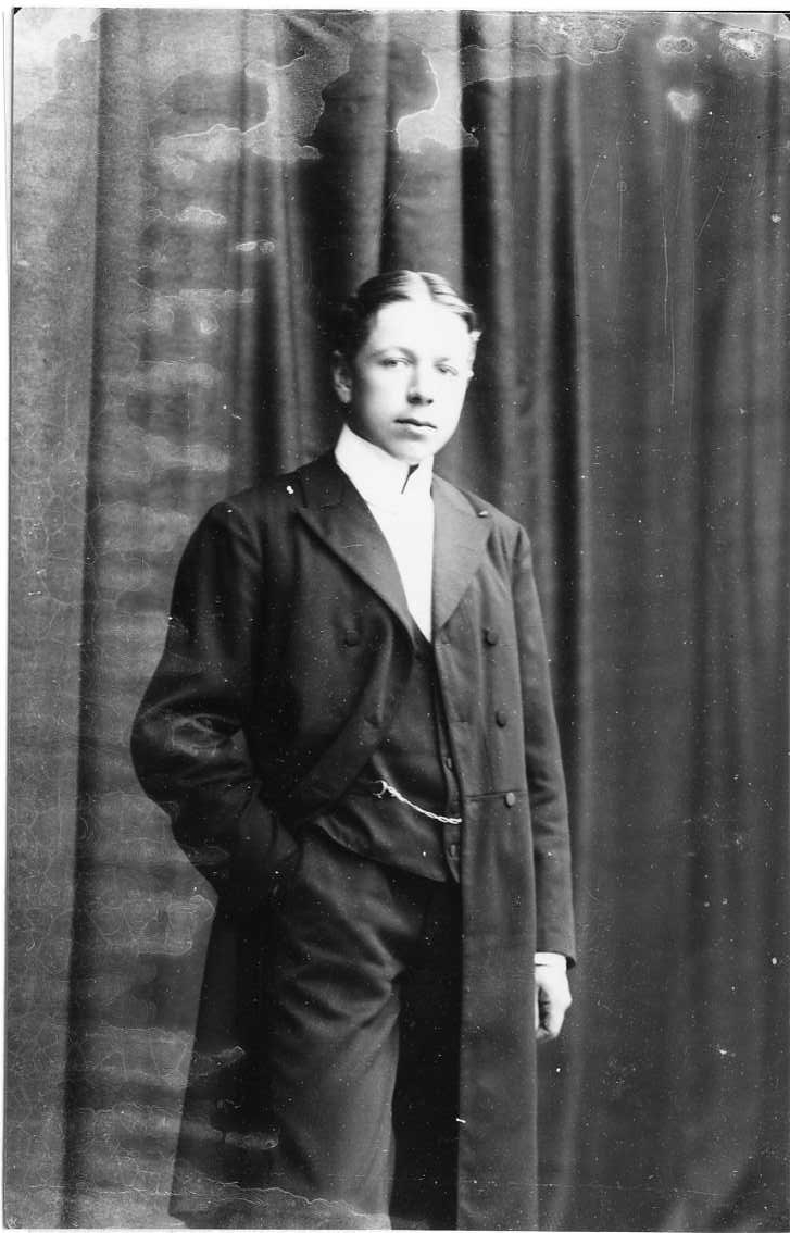 Porträtt av Olle Andersson, en ung man i bonjour och klockkedja i västen.