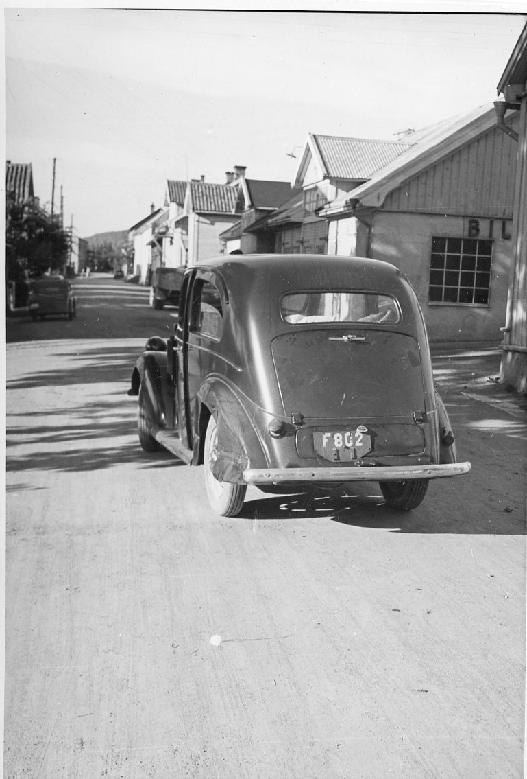 En personbil, möjligen krockskadad bak, står på Sjögatan i Gränna vid en bilverkstad.