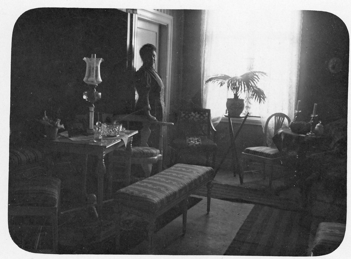 En kvinna står vid ett fönster i en hemmiljö. Vykort