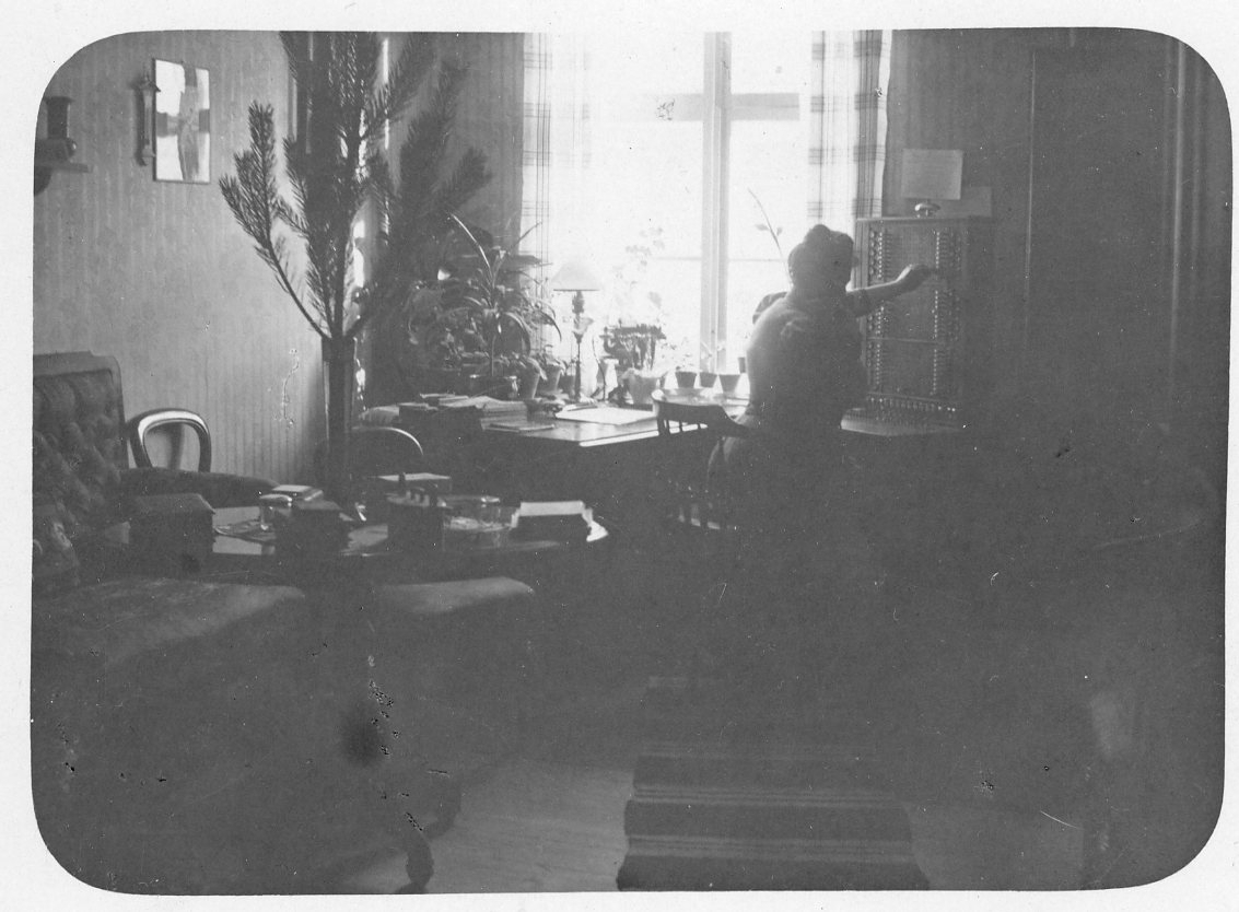 En kvinna sitter vid ett bord med ett skåp, hon öppnar skået. Det står intill ett fönster där ljuset faller in.