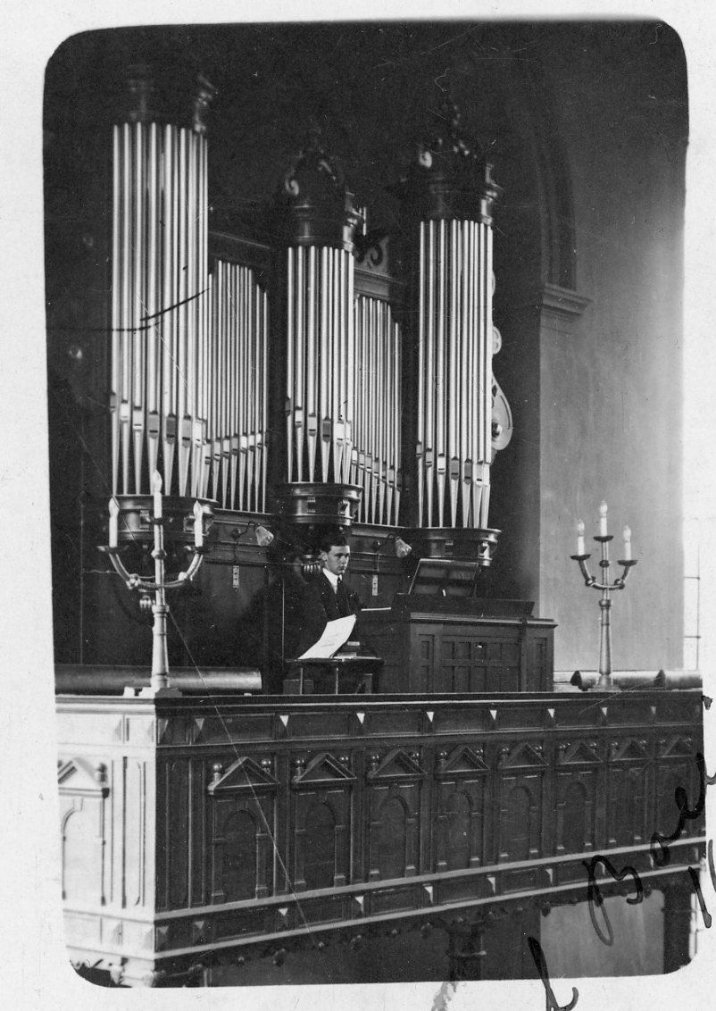 En ung man spelar på kyrkorgeln i Gränna kyrka.