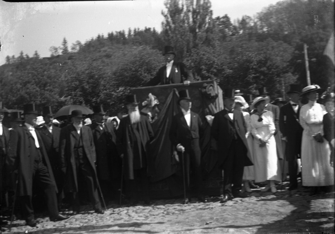 Högtidsklädda damer och herrar samlade nedanför en upphöjd talarstol där men man med hög står, alla vända mot fotografen. Okänt sammanhang och plats, men möjligen på Gränna torg.