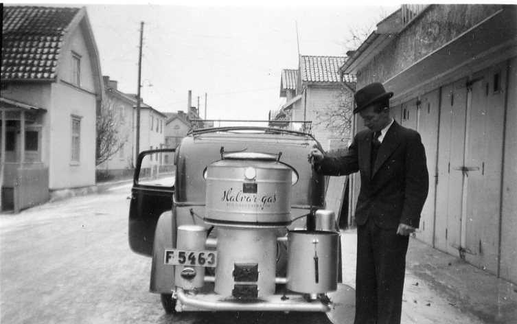 En man med hatt står utanför sin bilverkstad på Sjögatan i Gränna vid bakänden till sin bil. Bilen är försedd med ett gengasaggregat konstruerat av samma man. Det är märkt "Halvar gas".