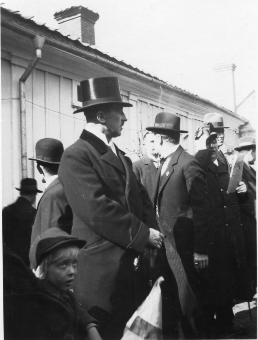 Män med bland annat hög hatt på gården till Francska gården i samband med invigning av Andréemuseet i samma fastighet.