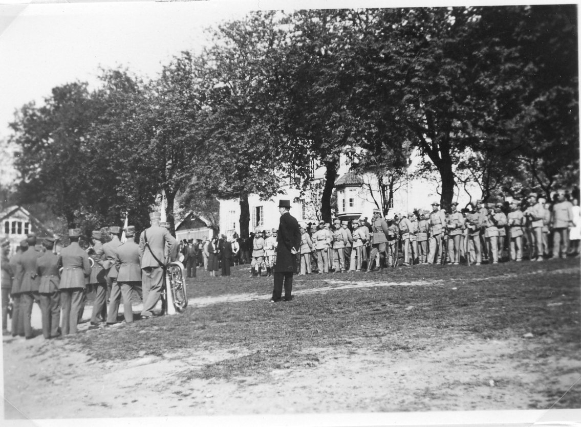 Militärer och en militär musikkår på östra delen av Gränna torg. Bakom träd skymtar Borgmästargården.