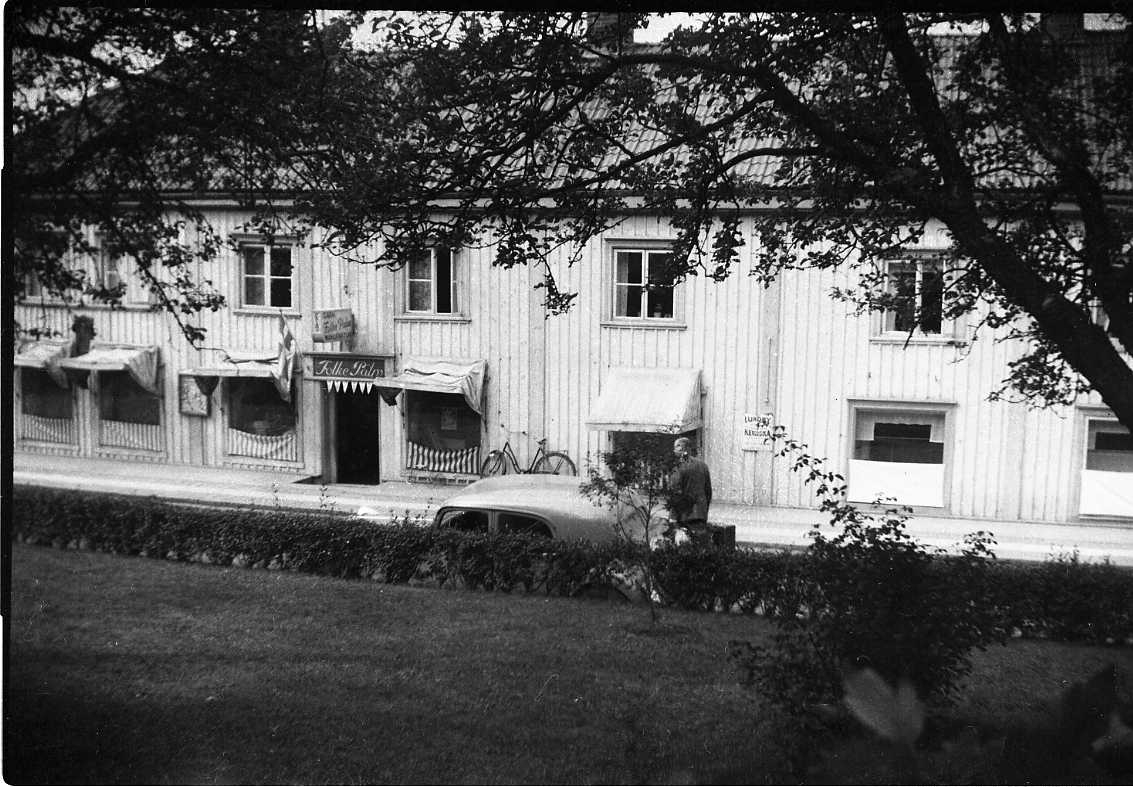 En fastighet på Brahegatan i Gränna, fotograferat mellan träd på motsatta sidan. Skylt för Folke Palms garn- och manufakturaffär.