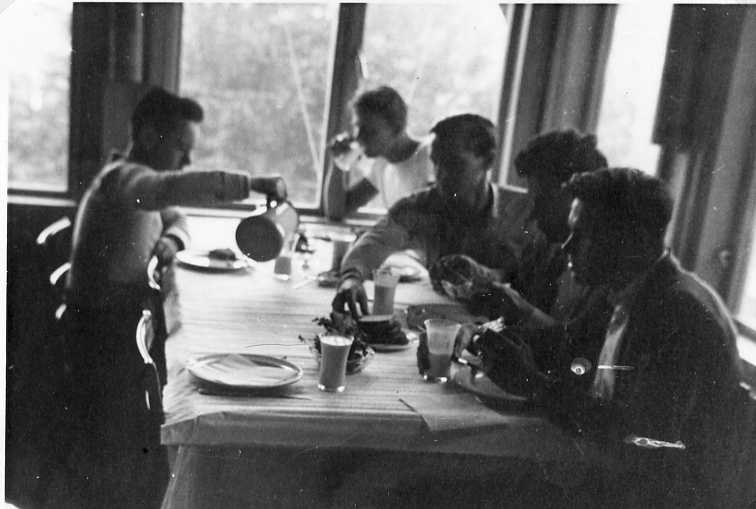 Fem unga män sitter vid ett dukat bord med tallrikar, en fat med bröd och möjligen mjölk i glasen.
