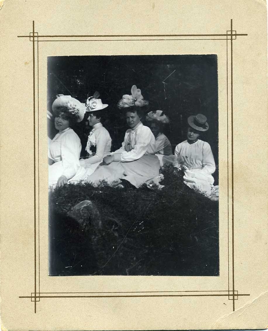 Fem unga kvinnor i stora hattar och ljusa klänningar sitter på en gräsmatta.