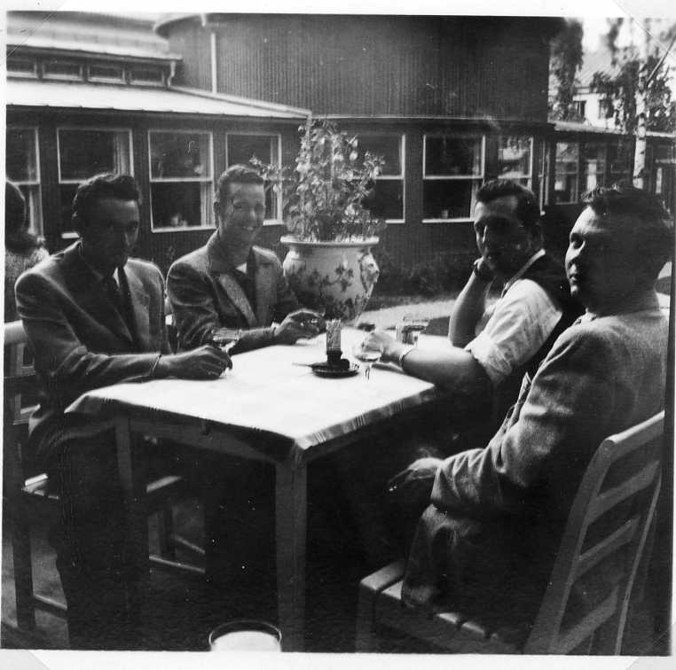 Fyra män med små glas med dryck på bordet framför sig. De sitter utomhus vid okända restaurang.